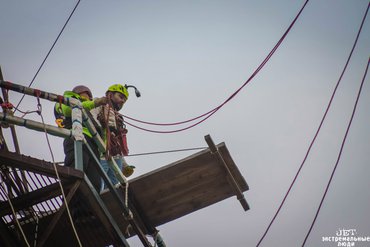 Высота может быть разной. От этого зависит угол крепления базовой верёвки к земле. При любой высоте джампер никогда не сможет задеть здание при полёте, для этого создаются соответствующие условия.
